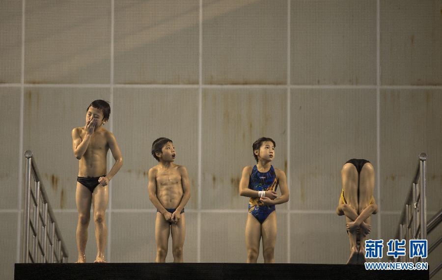 Little diving athletes are trained at the swimming center of Dongguan, Guangzhou, April 14, 2015. (Xinhuanew/Fei Maohua)