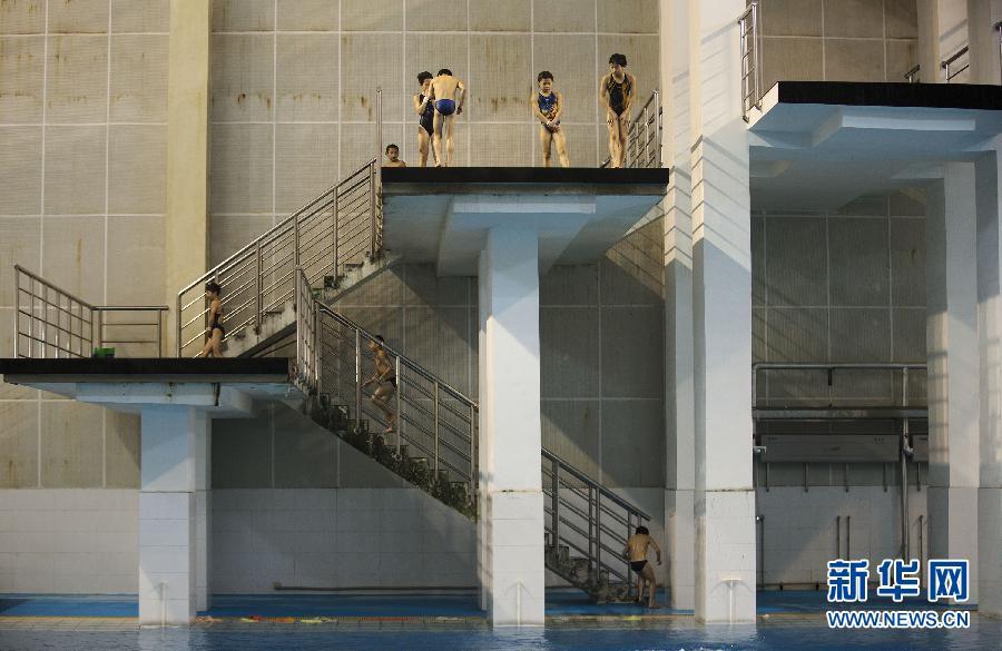 Little diving athletes are trained at the swimming center of Dongguan, Guangzhou, April 14, 2015. (Xinhuanew/Fei Maohua)
