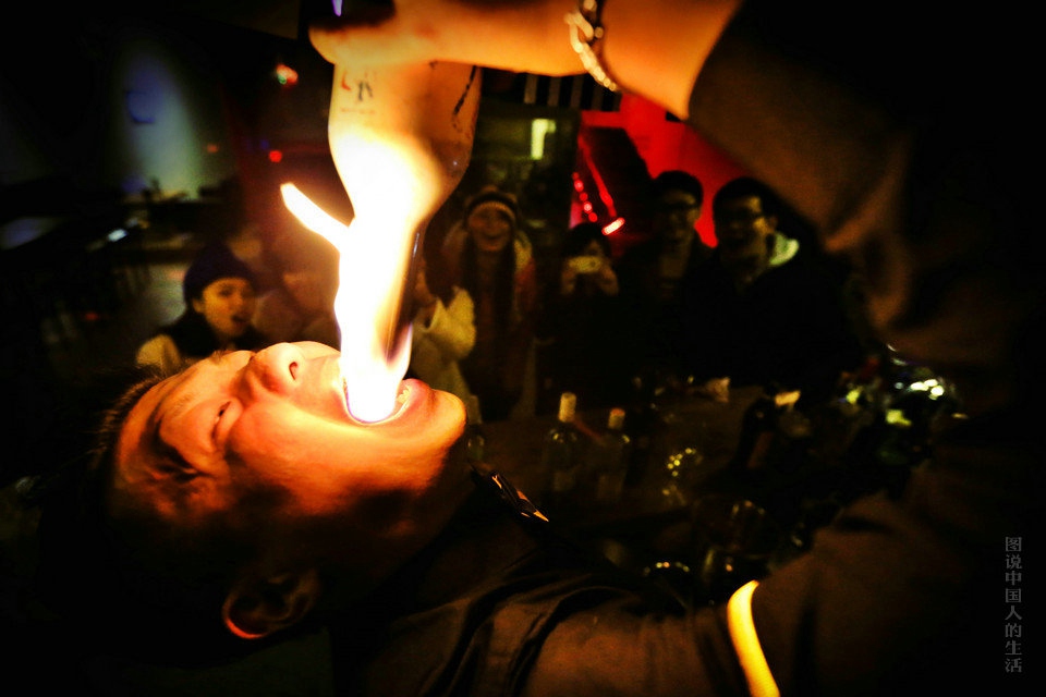Along's "fire-eating",a popular flair bartending trick is part of his flair bartending act. It is popular with his audience. (Photo/cnr.cn)