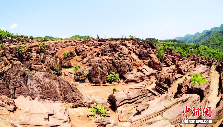 A large area of red rock forest is found in Baizhu village, 50 kilometers away from Youyang county, southwest China’s Chongqing city. Relevant authorities have taken measures to protect the forest. So far, nearly 66 hectares of red rock forest have been excavated, attracting many tourists to the site. (Chinanews/Cheng Bisheng)