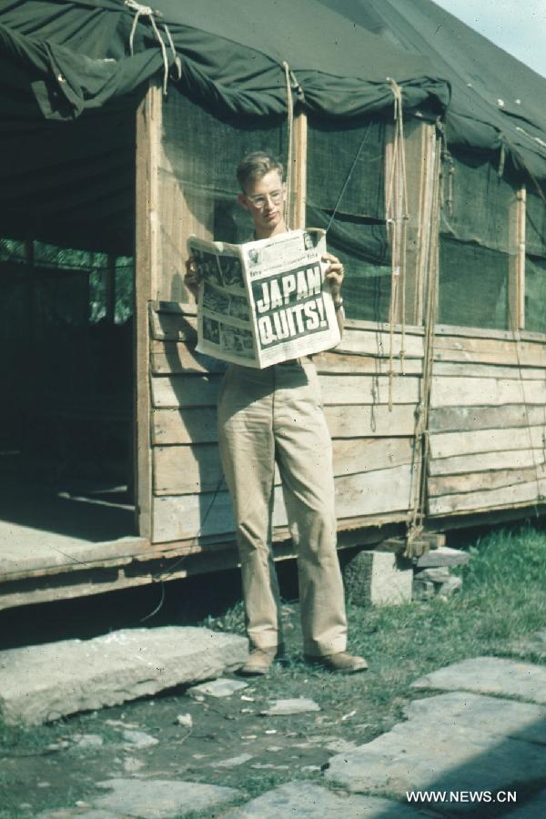 The file photos taken in August, 1945 shows U.S. veteran Joe Day reading English newspaper reporting on Japan's surrender in Zhijiang County, central China's Hunan Province. A museum in Zhijiang Dong Autonomous County of Hunan Province debuted 32 color photos on April 17, 2015 that documented Japan's surrender in the province in August 1945. They were among 223 photos of the Chinese Anti-Japanese War donated last November by Joe Day, a member of the Flying Tigers, the 1st American Volunteer Group formed in 1941 to help China drive out invading Japanese troops. On August 21-23, 1945, Japanese representatives fled to Zhijiang, handed over a map of Japanese troops deployed in China and signed a surrender memorandum. (Xinhua) |