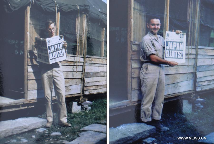 The copied file photos taken in August, 1945 shows members of the Flying Tigers reading English newspaper reporting on Japan's surrender in Zhijiang County, central China's Hunan Province. A museum in Zhijiang Dong Autonomous County of Hunan Province debuted 32 color photos on April 17, 2015 that documented Japan's surrender in the province in August 1945. They were among 223 photos of the Chinese Anti-Japanese War donated last November by Joe Day, a member of the Flying Tigers, the 1st American Volunteer Group formed in 1941 to help China drive out invading Japanese troops. On August 21-23, 1945, Japanese representatives fled to Zhijiang, handed over a map of Japanese troops deployed in China and signed a surrender memorandum. (Xinhua/Ming Xing)