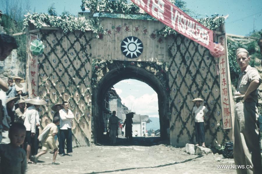 The file photo taken on August 21, 1945 by U.S. veteran Joe Day shows the scene of celebration upon Japan's surrender in Zhijiang County, central China's Hunan Province. A museum in Zhijiang Dong Autonomous County of Hunan Province debuted 32 color photos on April 17, 2015 that documented Japan's surrender in the province in August 1945. They were among 223 photos of the Chinese Anti-Japanese War donated last November by Joe Day, a member of the Flying Tigers, the 1st American Volunteer Group formed in 1941 to help China drive out invading Japanese troops. On August 21-23, 1945, Japanese representatives fled to Zhijiang, handed over a map of Japanese troops deployed in China and signed a surrender memorandum. (Xinhua) |