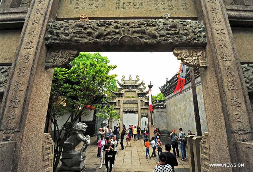 Tourists visit a memorial archway of Liu Family Temple in Nanxun Town of Huzhou City, east China's Zhejiang Province, April 19, 2015. A total of 13 ancient towns in east China's Zhejiang and Jiangsu provinces have recently joined hands to apply for the list of world heritage. The application work is expected to complete before March 2017. (Xinhua/Tan Jin)