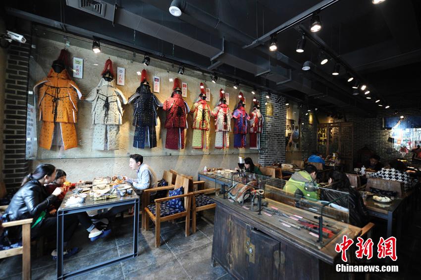 A museum-themed restaurant opens in Changchun, capital of northeast China's Jilin province, April 18, 2015. The restaurant exhibits clothes and handicrafts with features of northeast Chinese history. (CNS/Zhang Yao)