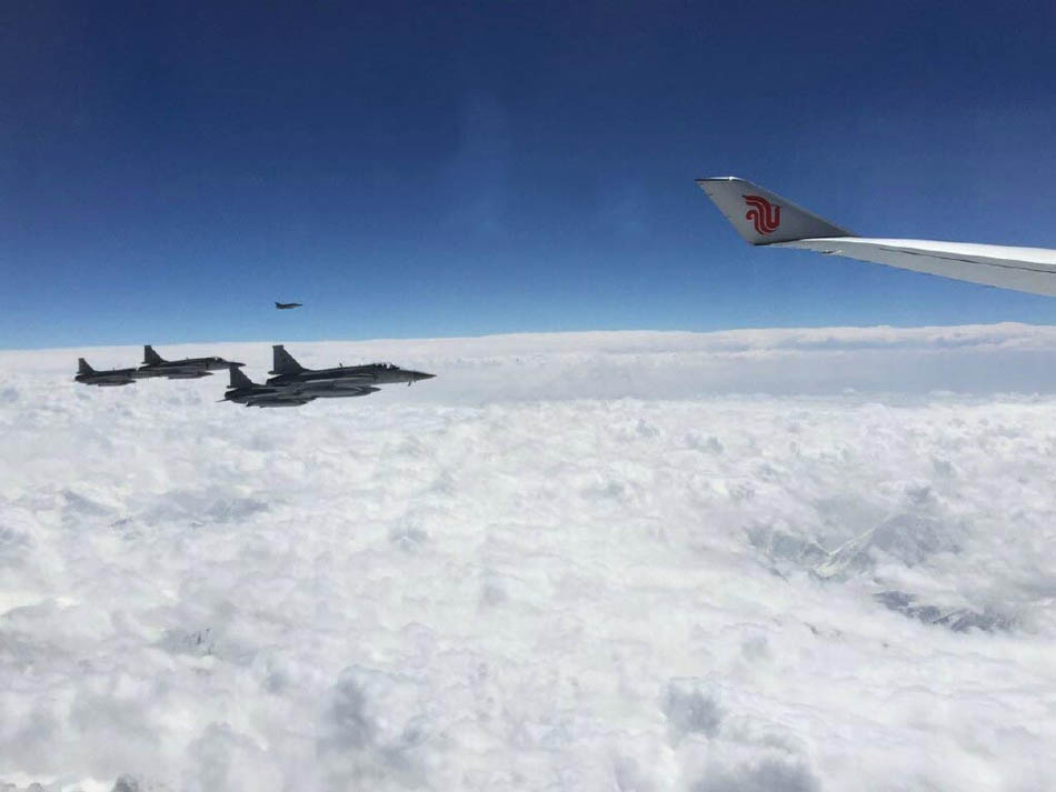 Eight JF-17 Thunder fighter jets from Pakistani Air Force escort Chinese President Xi Jinping's plane as it enters Pakistani air space on Monday, April 20, 2015. (CCTV/Wang Yingbo)