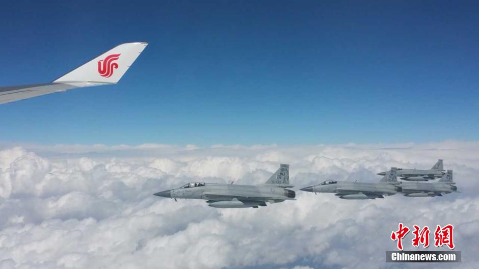 Eight JF-17 Thunder fighter jets from Pakistani Air Force escort Chinese President Xi Jinping's plane as it enters Pakistani air space on Monday, April 20, 2015. (CNS/Ouyang Kaiyu)