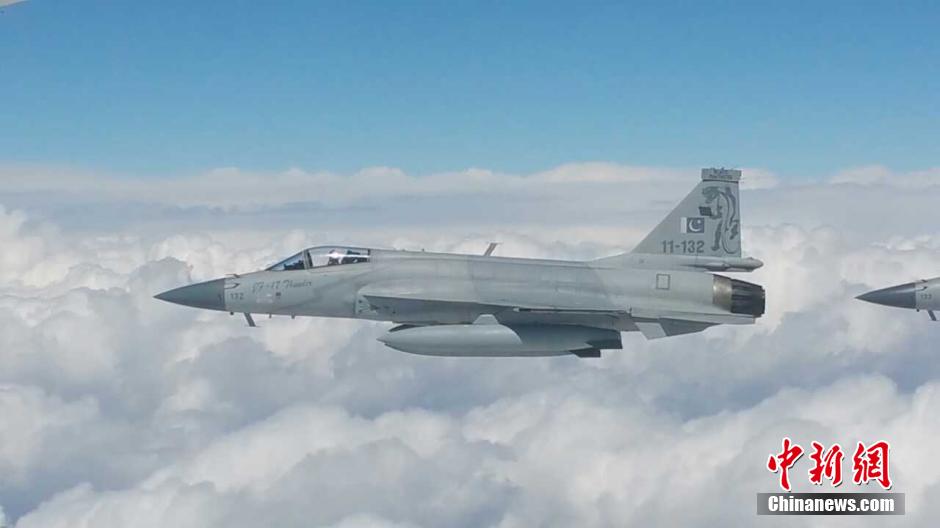 Eight JF-17 Thunder fighter jets from Pakistani Air Force escort Chinese President Xi Jinping's plane as it enters Pakistani air space on Monday, April 20, 2015. (CNS/Ouyang Kaiyu)