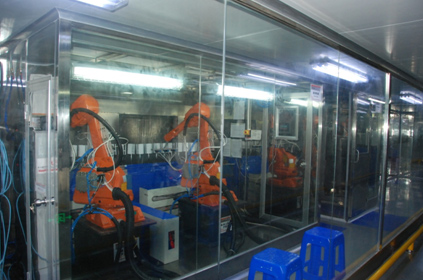 Robots with intelligent sensors glazing cellphone cases. These machines have helped to save 60 percent of the paint. (People's Daily Online/Fu Changchao) |
