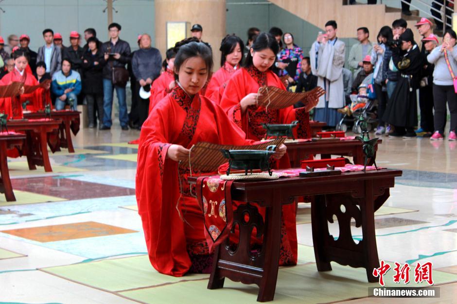 Girls participate in a female adult ceremony in Xi'an, capital city of northwestern China's Shaanxi Province on April 18, 2015. Wearing Han costumes they bowed to teachers and parents to declare that they're grown-ups. (CNS Photo)