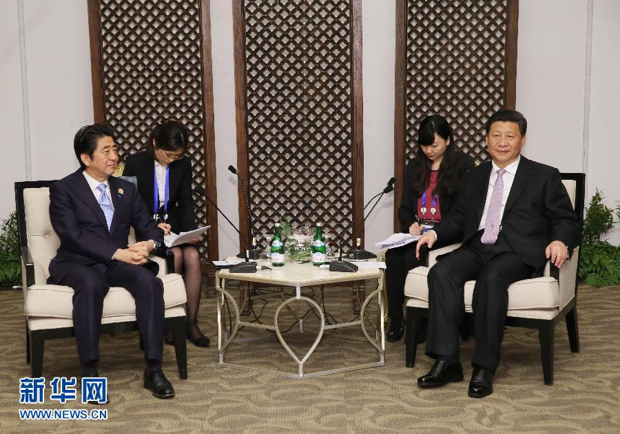 It was the second meeting between the Chinese and Japanese leaders since November last year, when Xi and Abe met on the sidelines of the 22nd Asia-Pacific Economic Cooperation (APEC) Economic Leaders' Meeting in Beijing. That meeting took place after the two countries reached a four-point agreement to improve bilateral ties, in which the two sides agreed to resume political, diplomatic and security dialogue while acknowledging different positions on the Diaoyu Islands.