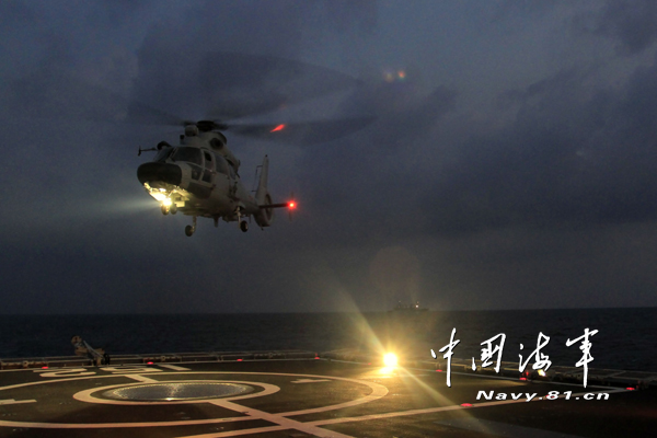 The 20th escort fleet of Chinese navy in the Gulf of Aden and waters off Somali conducted flight training for ship board helicopters on April 19, 2015. Two helicopters on missile destroyer Jinan and missile frigate Yiyang successfully finished this day and night training, with multiple training subjects completed. (Photo source: navy.81.cn)