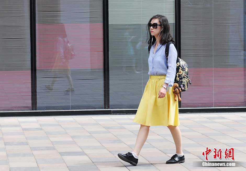 A great number of citizens in Beijing wear summer clothes on Tuesday as the highest temperature goes up to 27 degrees Celsius.(Photo/Chinanews.com)
