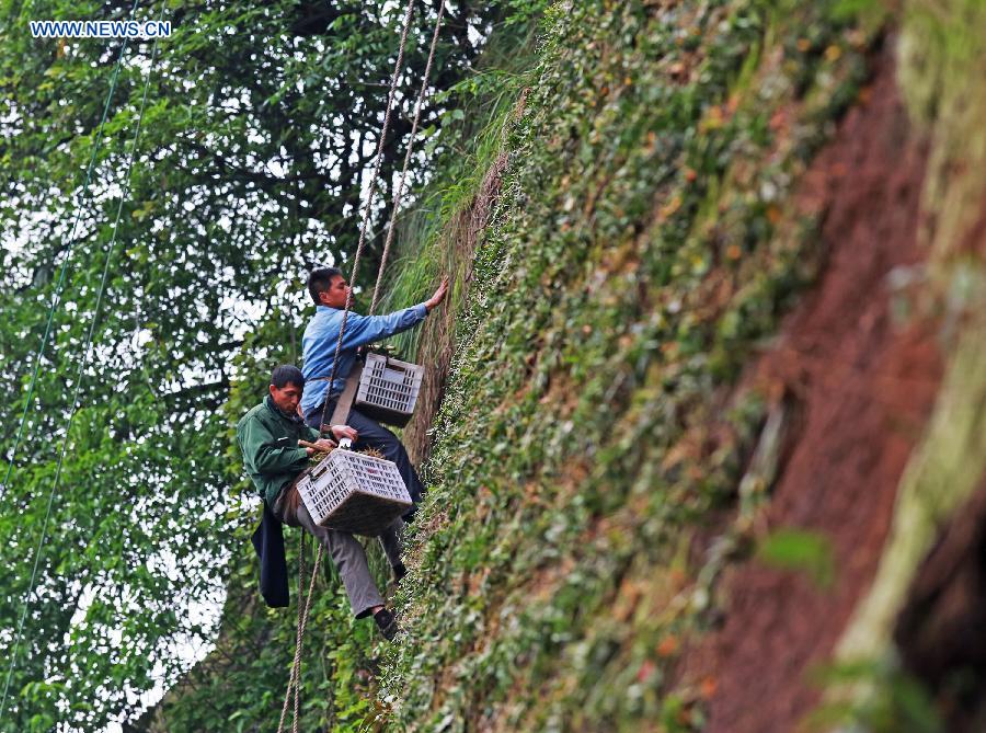 A farmer plants Dendrobium officinale Kimura et Migo, a kind of rare traditional Chinese medicine, in Wang'er Town of Qianshan County, east China's Jiangxi Province, April 22, 2015. Xu Nanjing and his friends, farmers of Wang'er Town, began to plant Dendrobium officinale Kimura et Migo since 2013. The output is estimated to reach about 300 kilograms next year and is expected to yield 1 million RMB yuan (161,300 U.S. dollars). (Xinhua/Ding Minghua) |