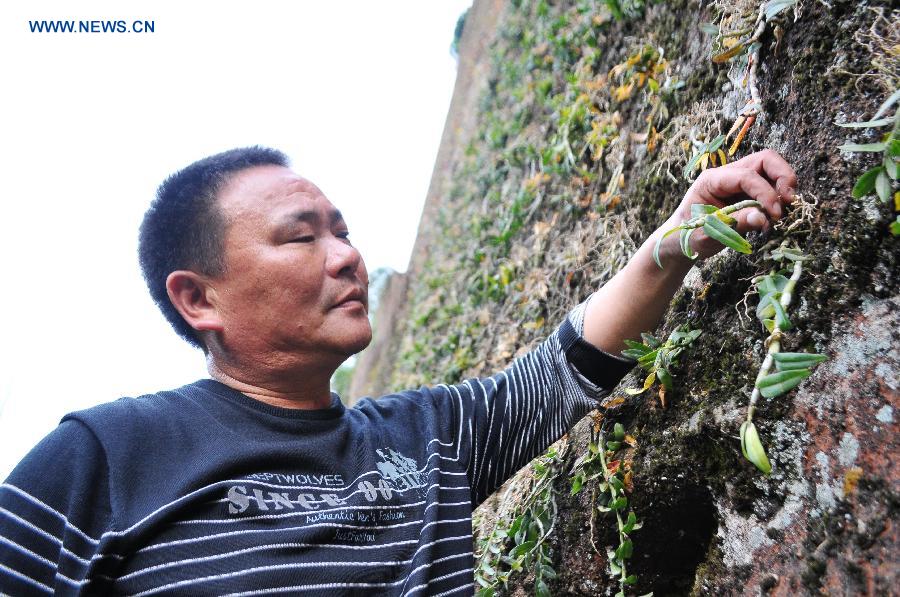 Xu Nanjing checks the growth of Dendrobium officinale Kimura et Migo, a kind of rare traditional Chinese medicine, in Wang'er Town of Qianshan County, east China's Jiangxi Province, April 22, 2015. Xu Nanjing and his friends, farmers of Wang'er Town, began to plant Dendrobium officinale Kimura et Migo since 2013. The output is estimated to reach about 300 kilograms next year and is expected to yield 1 million RMB yuan (161,300 U.S. dollars). (Xinhua/Ding Minghua) |