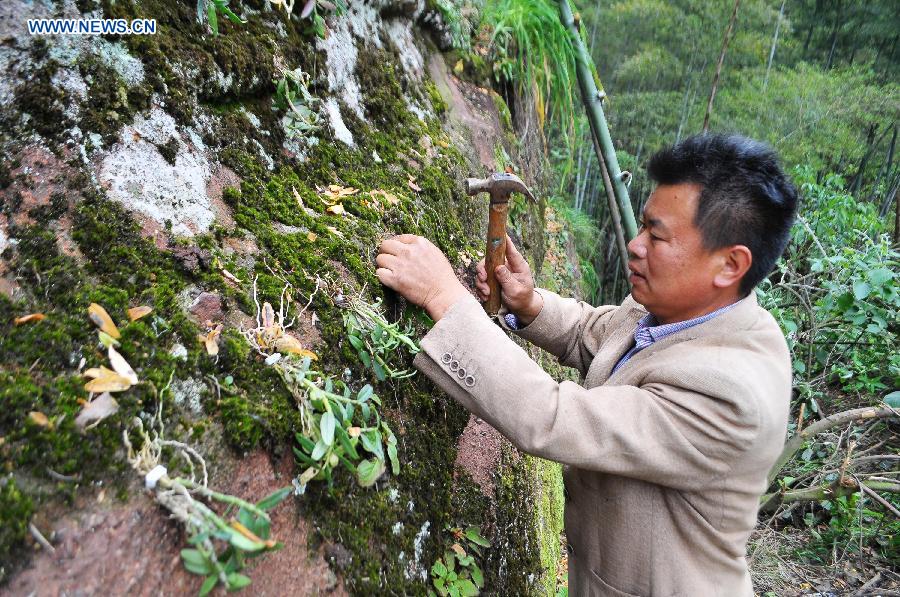 A farmer plants Dendrobium officinale Kimura et Migo, a kind of rare traditional Chinese medicine, in Wang'er Town of Qianshan County, east China's Jiangxi Province, April 22, 2015. Xu Nanjing and his friends, farmers of Wang'er Town, began to plant Dendrobium officinale Kimura et Migo since 2013. The output is estimated to reach about 300 kilograms next year and is expected to yield 1 million RMB yuan (161,300 U.S. dollars). (Xinhua/Ding Minghua) |