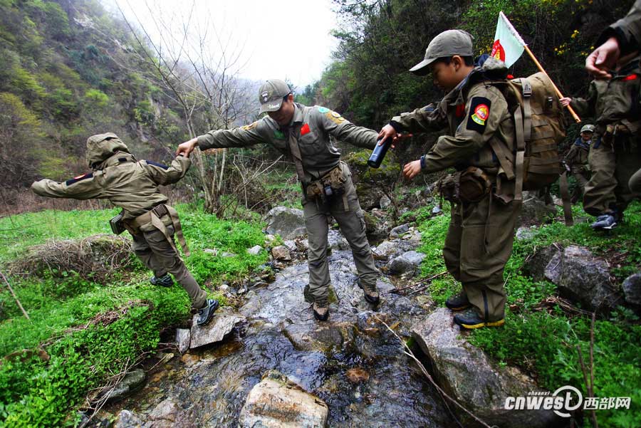 More than 20 primary school students learn outdoor skills including outdoor cooking and experience their lives in the wild in Yingpan Township, Shangluo, northwest China's Shaanxi Province on April 18, 2015. (Photo/cnwest.com)