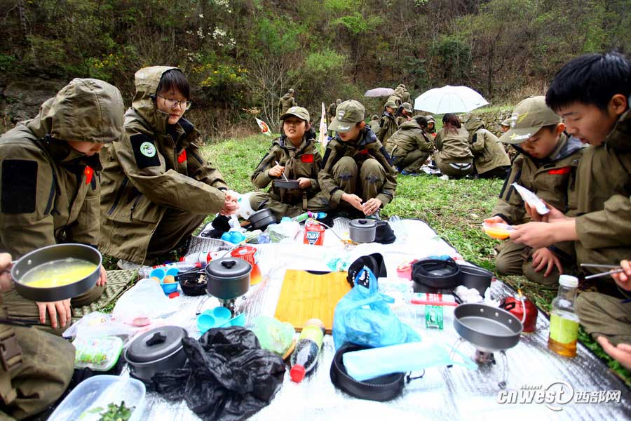 More than 20 primary school students learn outdoor skills including outdoor cooking and experience their lives in the wild in Yingpan Township, Shangluo, northwest China's Shaanxi Province on April 18, 2015. (Photo/cnwest.com)