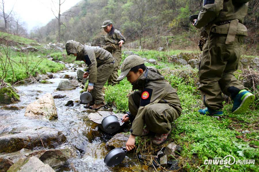 More than 20 primary school students learn outdoor skills including outdoor cooking and experience their lives in the wild in Yingpan Township, Shangluo, northwest China's Shaanxi Province on April 18, 2015. (Photo/cnwest.com)
