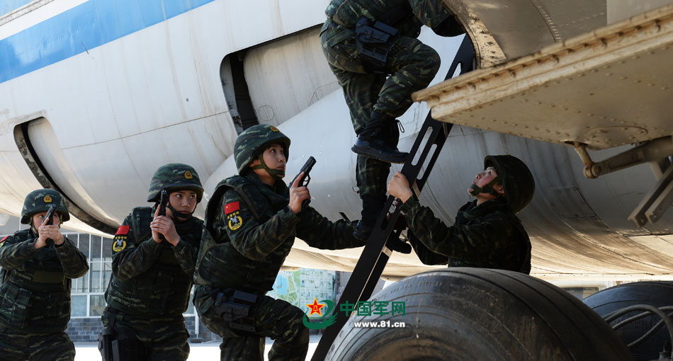 Female members approach the plane in an anti-hijacking drill on March 23, 2015. (www.81.cn/Li Jing)
