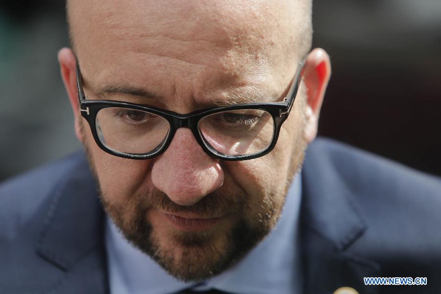 Belgian Prime Minister Charles Michel talks to the press as he arrives at the European Union (EU) extraordinary summit to discuss how to address the migratory pressures in the Mediterranean at the EU headquarters in Brussels, Belgium, on April 23, 2015. Only 28 migrants out of 700 seem to have survived by far after their boat capsized some 120 miles south of Lampedusa, Italy on Saturday night. (Xinhua/Zhou Lei)