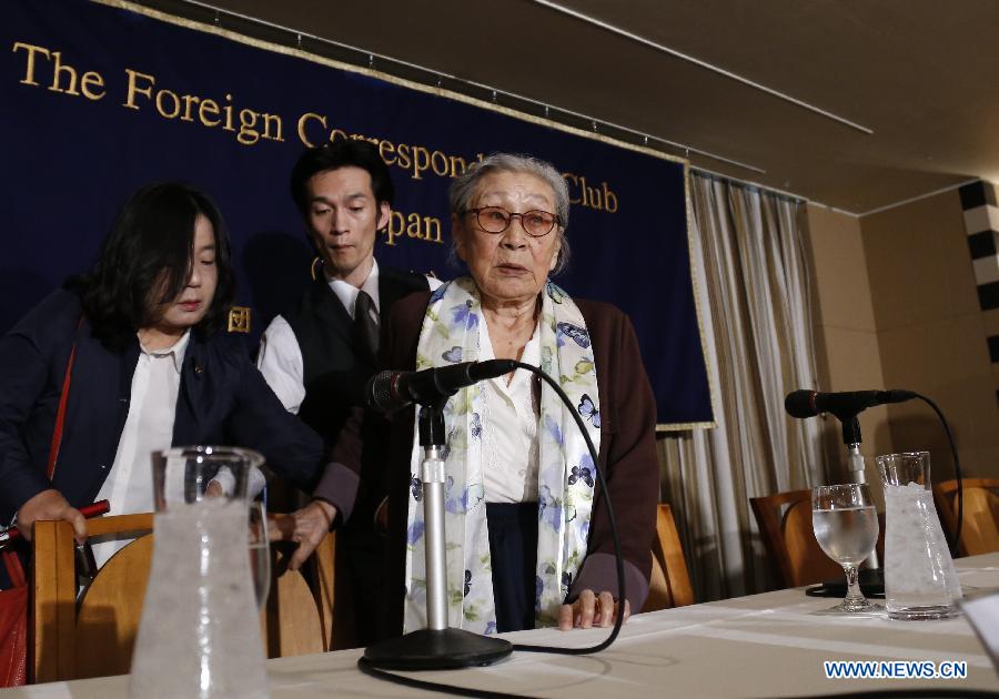 Kim Bok-tong (front), a former "comfort woman", attends a press conference in Tokyo, Japan, April 24, 2015. (Xinhua/Stringer)