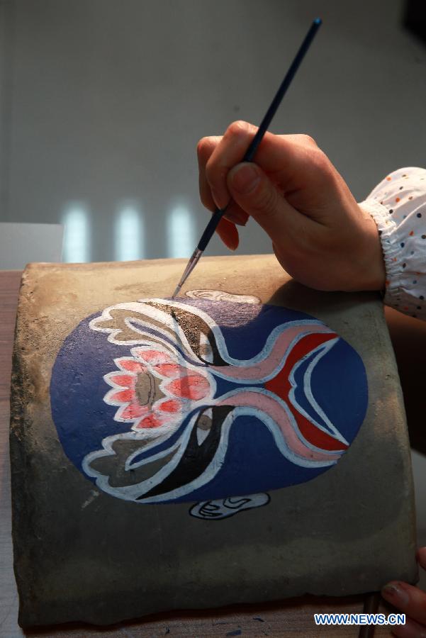 An artist paints on a discarded tile at Wuli Historical Relic Management Bureau in Binzhou, east China's Shandong Province, April 23, 2015. Artists here have collected more than 100,000 discarded bricks, tiles and other construction garbages to create artworks. (Xinhua/Li Zhenping)