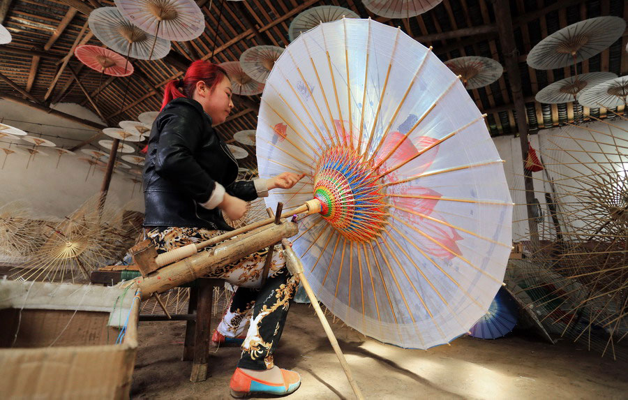 A villager makes oiled paper umbrella. (Xinhua/Liu Xueyi)