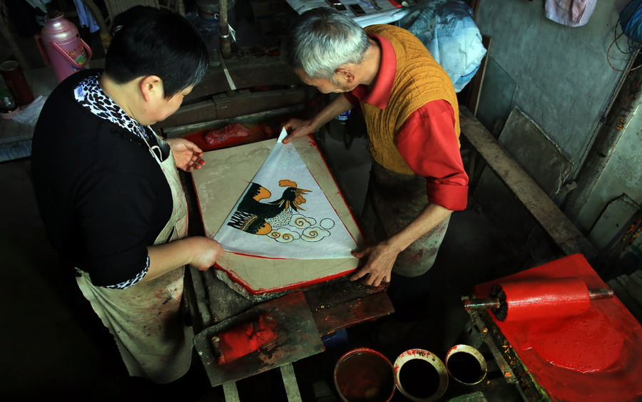 Villagers mimeograph the cover of the umbrellas. (Xinhua/Liu Xueyi)
