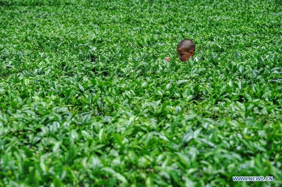 A child helps to pick up tea leaves on a mountain in Huishui County of Qiannan Buyi Autonomous Prefecture, southwest China's Guizhou Province, April 25, 2015. Tea farmers here are busy with picking up the last batch of spring tea leaves. (Xinhua/Ou Dongqu) |