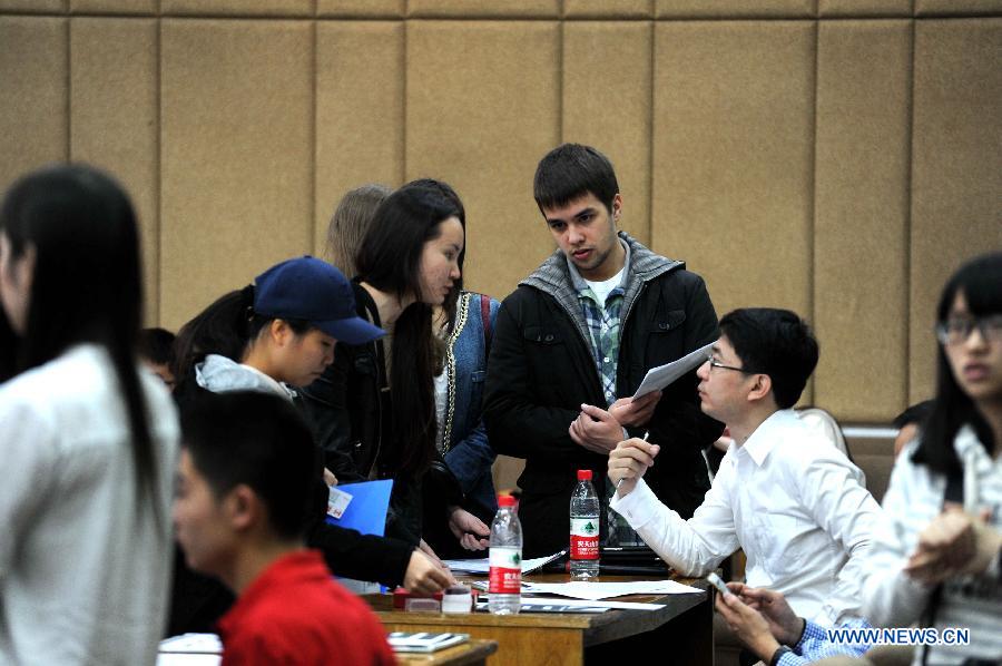 Foreign graduates talk with recruiters at a job fair especially held for foreign students in Heilongjiang University in Harbin, capital of northeast China's Heilongjiang Province, April 25, 2015. More than 200 foreign graduates from ten countries tried to find a job at the fair. (Xinhua/Wang Song)