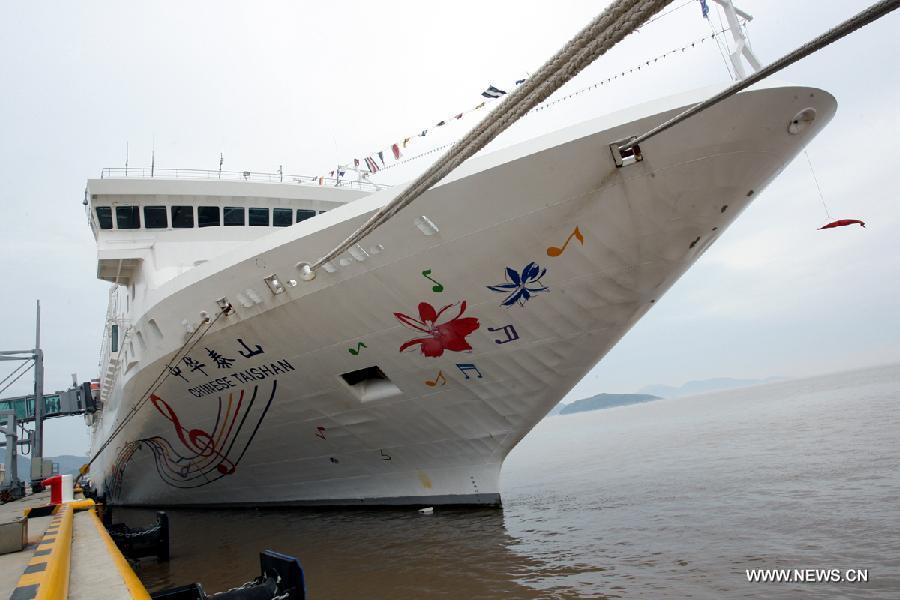Passenger liner Chinese Taishan docks at a port in Zhoushan, east China's Zhejiang Province, April 24, 2015. A new route linking Zhoushan and southeast China's Taiwan was officially launched on Friday, as nearly 900 passengers started their journey to Taiwan from Zhoushan by the passenger liner named as Chinese Taishan. (Xinhua/Shen Jizhong) |