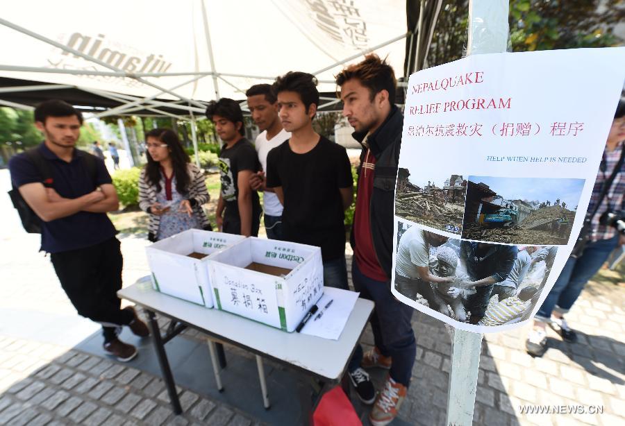 Nepalese students ask for donations to help the people affected by Nepal earthquake, at Nanjing University of Aeronautics and Astronautics, east China's Jiangsu Province, April 26, 2015. The death toll in Nepal has exceeded 2,150 including at least 700 killed in capital Kathmandu and about 5,460 others have been wounded, National police spokesman Kamal Singh Bam said on Sunday. (Xinhua/Sun Can)