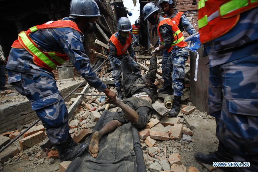 Members of the Nepalese Armed Police Force carry the body of a victim from a house in Bhaktapur, Nepal, April 26, 2015. A total of 3,218 people were killed and about 6,500 others injured in the powerful earthquake that struck Nepal on Saturday, the authorities said April 27. (Xinhua/Pratap Thapa) |