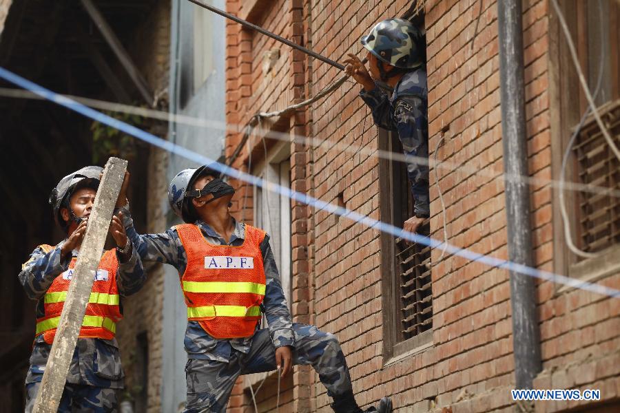 Members of the Nepalese Armed Police Force try to rescue people stuck in houses in Bhaktapur, Nepal, April 26, 2015. A total of 3,218 people were killed and about 6,500 others injured in the powerful earthquake that struck Nepal on Saturday, the authorities said April 27. (Xinhua/Pratap Thapa) |