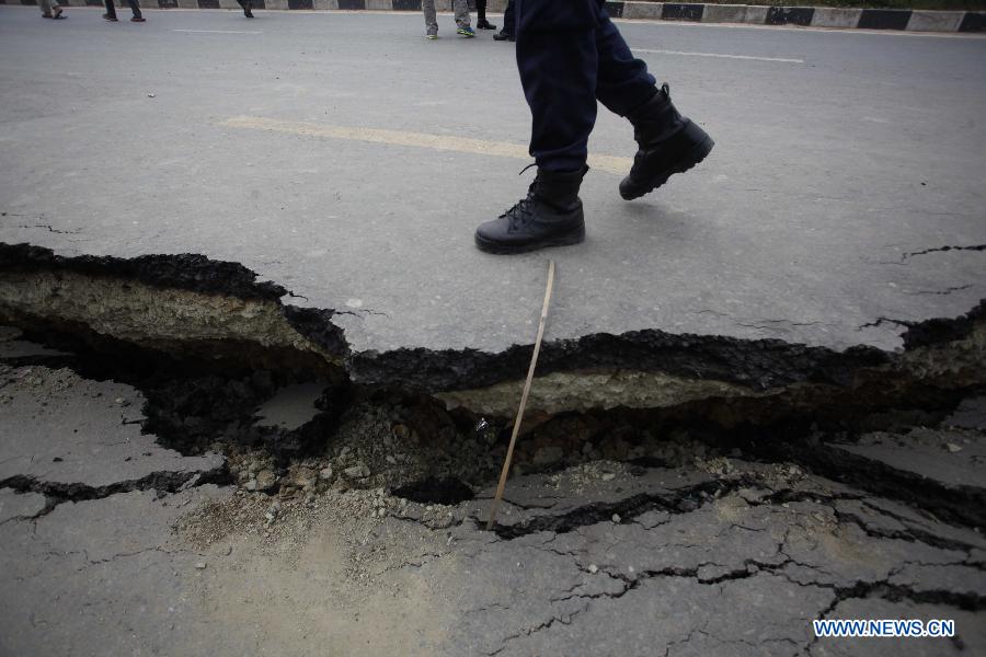 A man walks on a damaged road in Bhaktapur, Nepal, April 26, 2015. A total of 3,218 people were killed and about 6,500 others injured in the powerful earthquake that struck Nepal on Saturday, the authorities said April 27. (Xinhua/Pratap Thapa) |