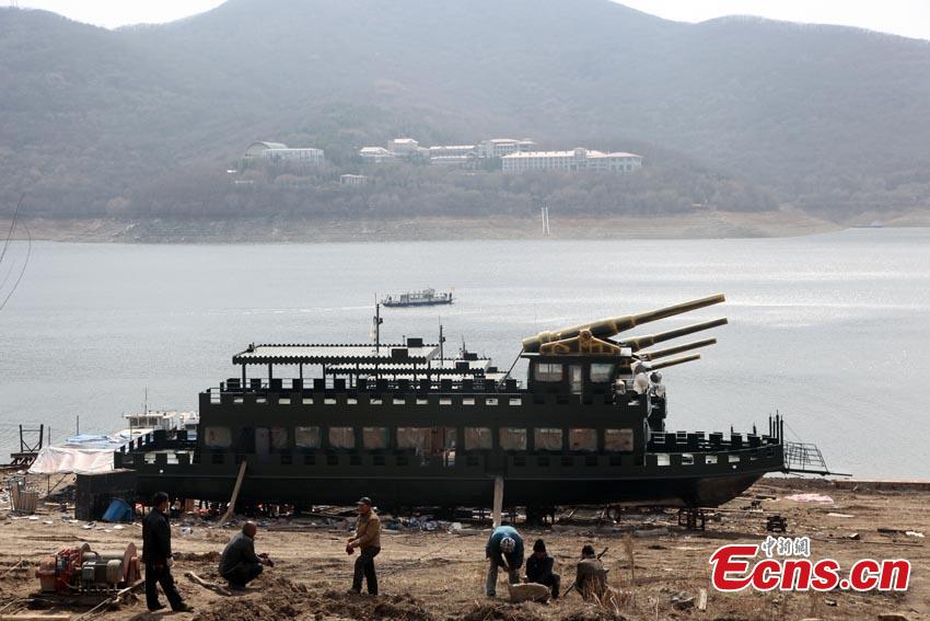 A replica of a warship from the reign of Emperor Kangxi in the Qing Dynasty (1644-1911) is under construction at Songhua Lake in Jilin city, Northeast China’s Jilin province. Six warships have been launched, with more to be completed. The city has been a base for shipbuilding since as early as the Ming Dynasty (1368-1644). (Photo: China News Service/Cang Yan) |