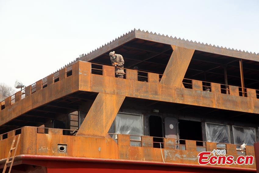 A replica of a warship from the reign of Emperor Kangxi in the Qing Dynasty (1644-1911) is under construction at Songhua Lake in Jilin city, Northeast China’s Jilin province. Six warships have been launched, with more to be completed. The city has been a base for shipbuilding since as early as the Ming Dynasty (1368-1644). (Photo: China News Service/Cang Yan) |