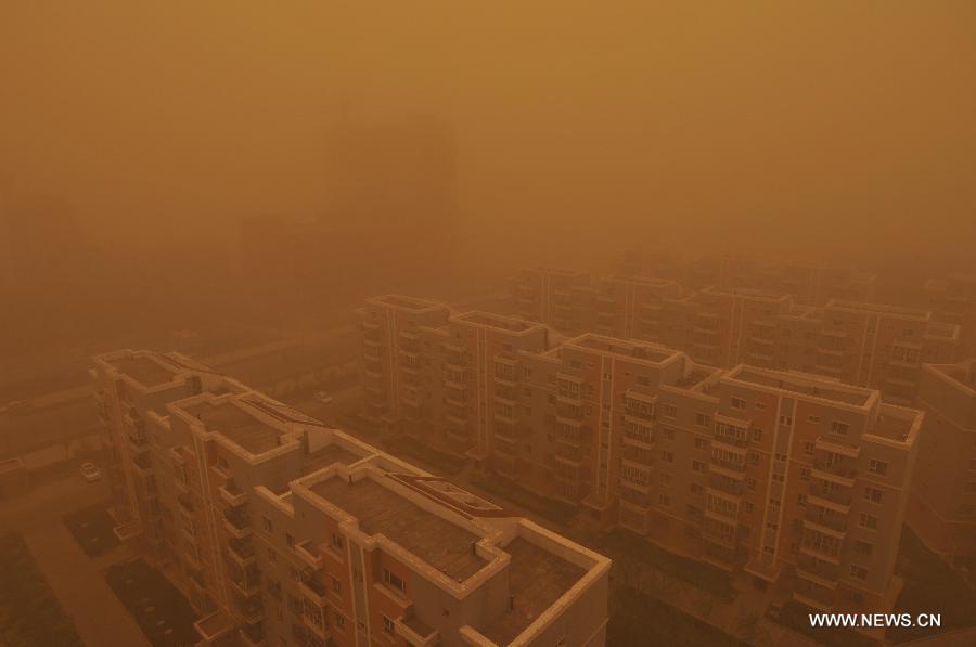 Buildings are shrouded in sand and dust in Wujiaqu, northwest China's Xinjiang Uygur Autonomous Region, April 27, 2015. The city was hit by moderate gale on Monday. (Xinhua/Chen Peng)