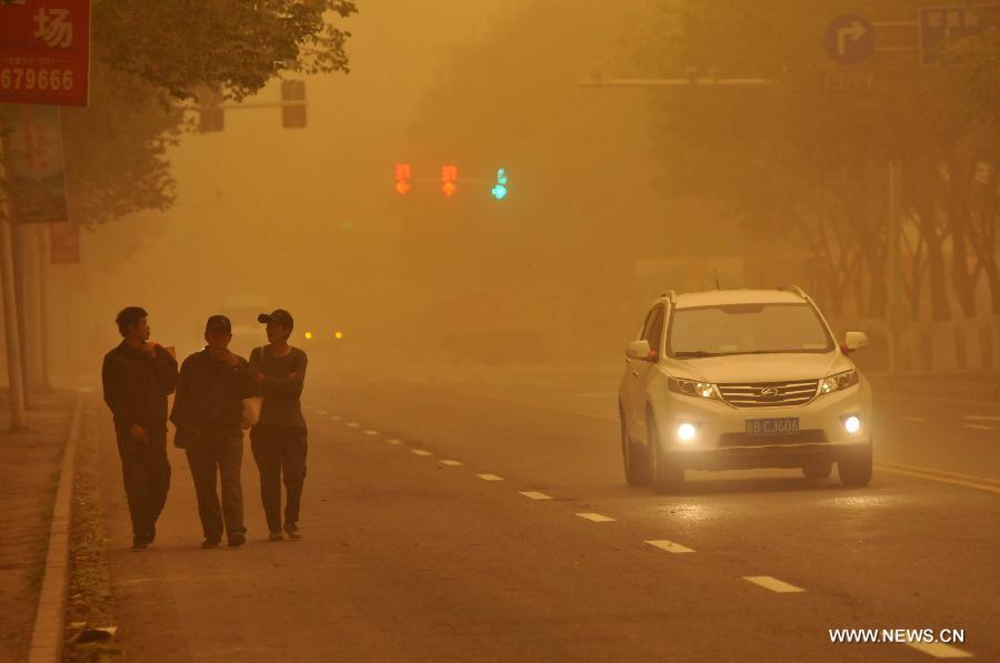 People walk in sand and dust in Wujiaqu, northwest China's Xinjiang Uygur Autonomous Region, April 27, 2015. The city was hit by moderate gale on Monday. (Xinhua/Chen Peng)