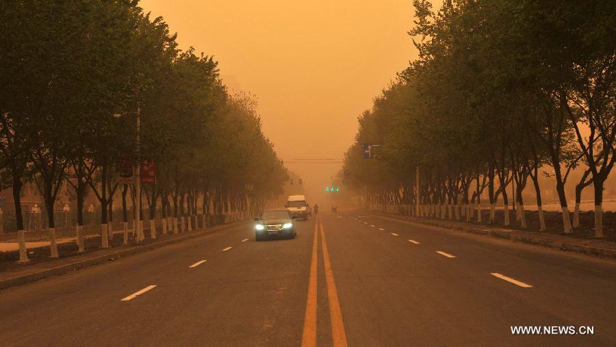 Vehicles run in sand and dust in Wujiaqu, northwest China's Xinjiang Uygur Autonomous Region, April 27, 2015. The city was hit by moderate gale on Monday. (Xinhua/Chen Peng)