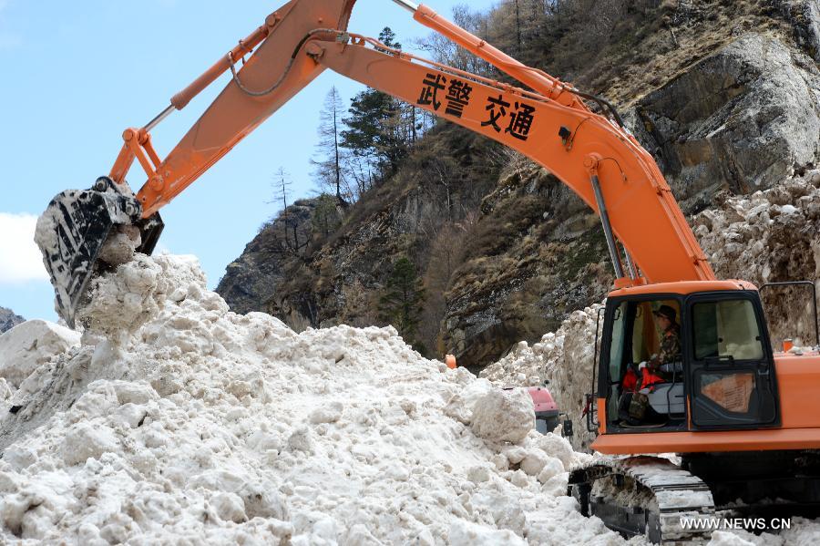A navvy of armed traffic police repairs a snowslide affected road to quake-hit Jilung County in Xigaze City, southwest China's Tibet Autonomous Region, April 27, 2015. A 8.1-magnitude quake shook Nepal at 2:11 p.m. (Beijing Time) on Saturday, killing at least 3,218 people. The quake also strongly affected parts of Tibet, adjacent to Nepal. (Xinhua/Chen Tianhu) |