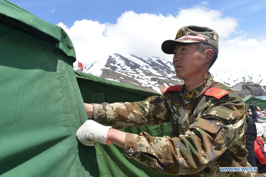 A soldier sets up makeshift tents at a middle school in Nyalam County in Xigaze, southwest China's Tibet Autonomous Region, April 26, 2015. Death toll in southwest China's Tibet Autonomous Region from the earthquake that struck neighboring Nepal on Saturday has climbed to 18. A total of 55 people there were injured, according to the regional disaster relief headquarters. (Xinhua/Zhang Quan) |