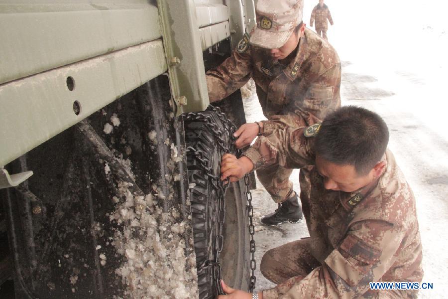 Soldiers mount tyre chains on a heavy truck carrying relief materials in southwest China's Tibet Autonomous Region, April 26, 2015. China is mobilizing all kinds of resources from rescue teams to relief supplies to the earthquake-hit Tibet Autonomous Region and the neighboring Nepal on the other side of the world's highest mountain. (Xinhua/Li Yuanhua) |