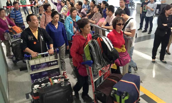 Passengers trapped in Nepal return China by a rescuing flight in Chengdu, southwest China's Sichuan Province, April 26, 2015. A rescuing flight carrying 198 passengers who were trapped in Nepal after a powerful earthquake struck the country arrived in Chengdu Sunday. (Xinhua/Xue Yubin) |