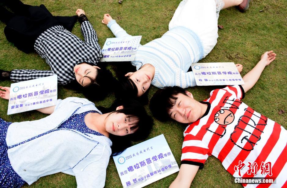 Students of UoG-UESTC Joint School (A four year undergraduate program jointly offered by the University of Glasgow and the University of Electronic Science & Technology of China) took stylish enrolment advertising photos in the alameda, teaching building, playground and dormitory of the school in late April 2015. Students held signs with words like “I am waiting for you in UoG-UESTC Joint School”. (Chinanews/Zhong Xin)