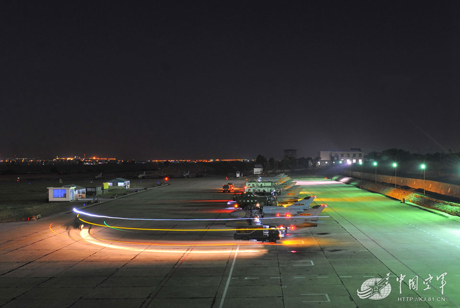 J-7 fighters of the Air force of the People's Liberation Army conduct training day and night at a military airport in southwest China recently. The training aims to improve the troop's coordination ability. (81.cn/Photo)