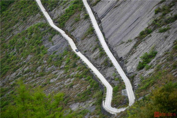 In the mountains of west Hubei province, there is a steep mountain road dug up by the locals. People call the road a “sky road” as it hangs above the mountain if they look at it from afar. (Xinhua/Song Wen)