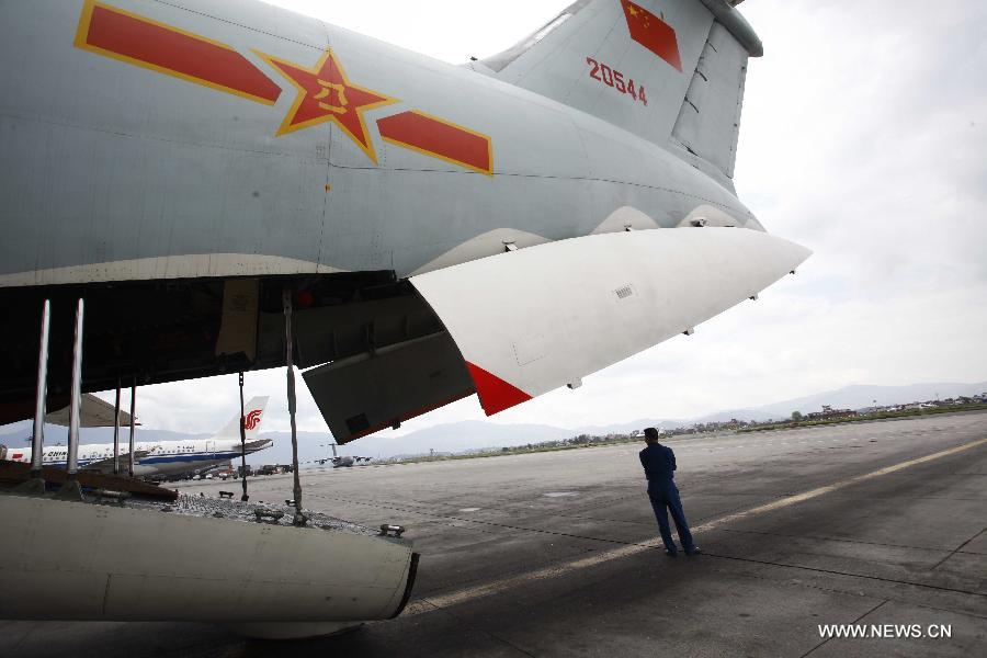 Photo taken on April 28, 2015 shows a plane carrying members of Chinese People's Liberation Army Air Force arrive in Nepal to provide aid following Saturday's earthquake at Tribhuvan International Airport in Kathmandu, Nepal. (Xinhua/Pratap Thapa)