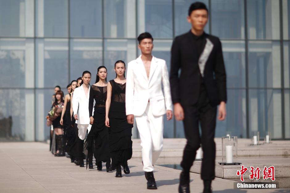 Models present creations of Taiwan designer Gioia Pan in an outdoor show of the 2015 Qingdao Fashion Week on April 26, 2015. (Chinanews/Sheng Jiapeng)